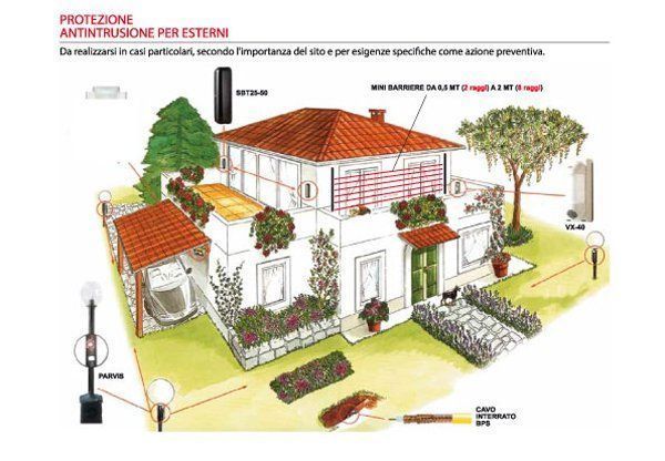 - sistemi di pre-allarme esterno, attraverso rivelatori per la protezione esterna delle facciate dell’abitazione, rilevatori di movimento volumetrici, da interramento di onde subsoniche e barriere di protezione perimetrale a microonde.